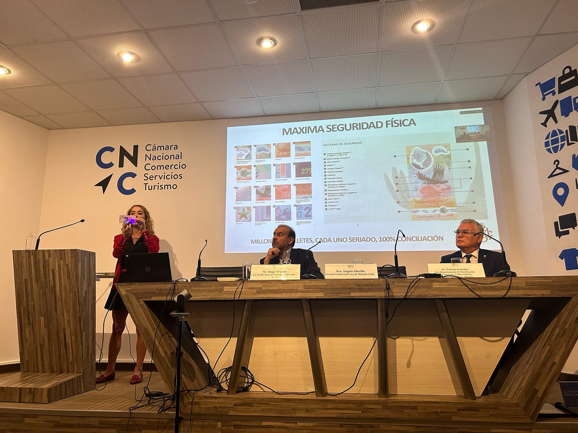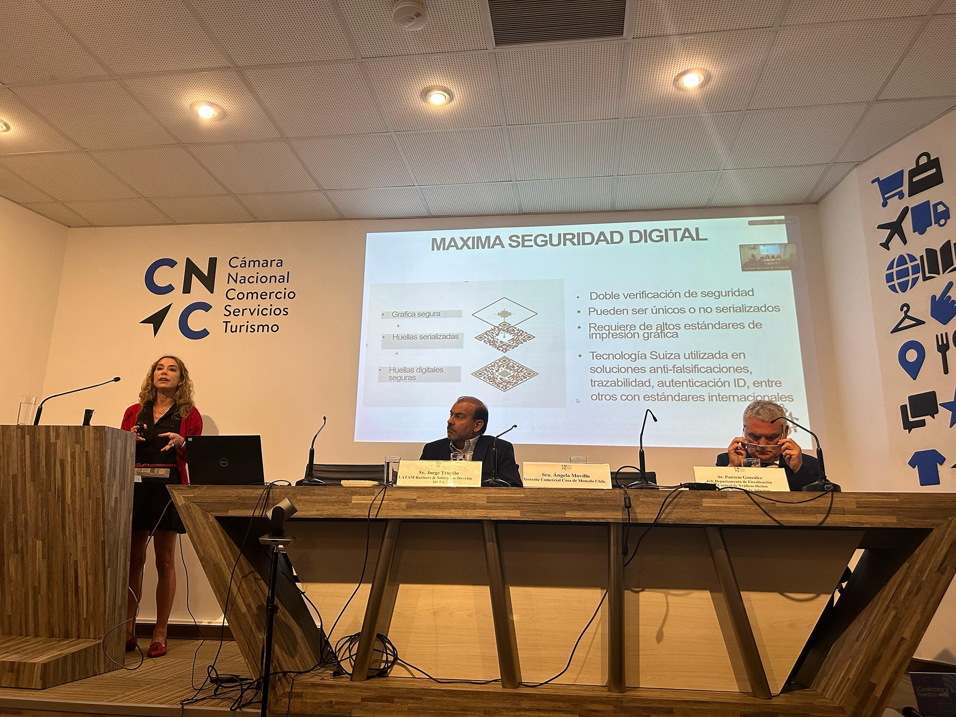 El pasado martes 18 de marzo, Ángela Movillo Hermosilla, gerenta comercial de Casa de Moneda de Chile, participó en el seminario: “Tecnologías de protección contra la falsificación”, actividad organizada por la Cámara Nacional de Comercio, Servicios y Turismo de Chile.