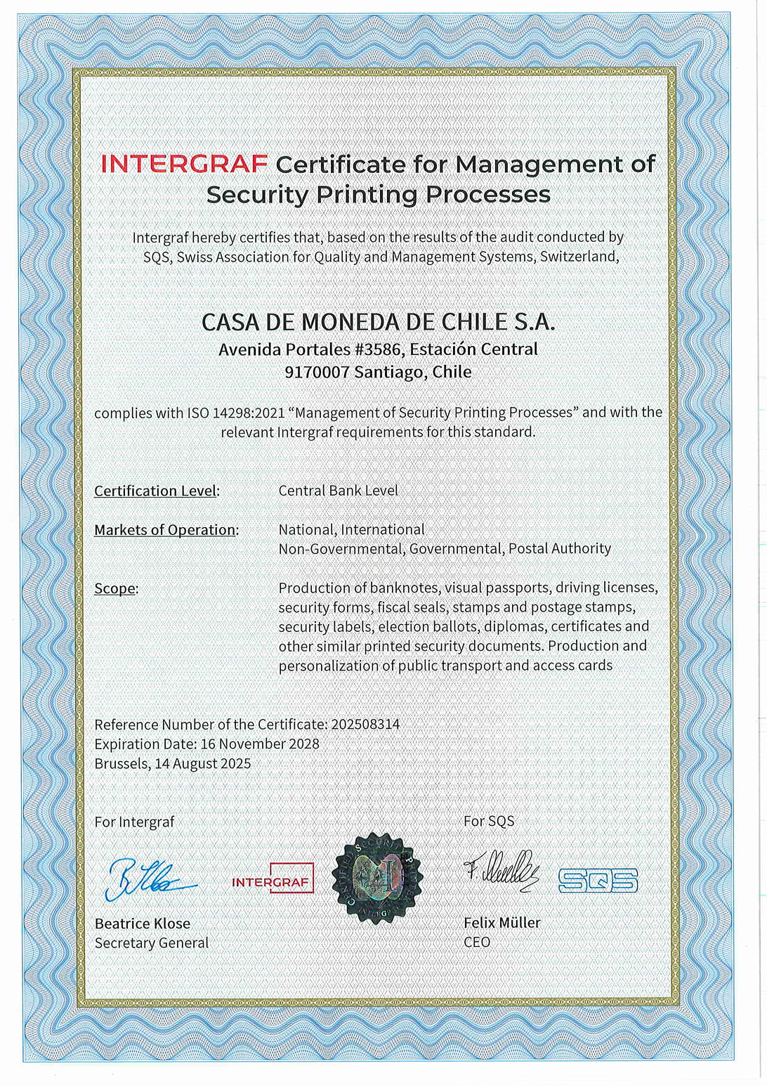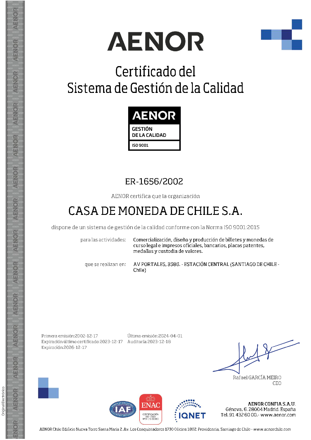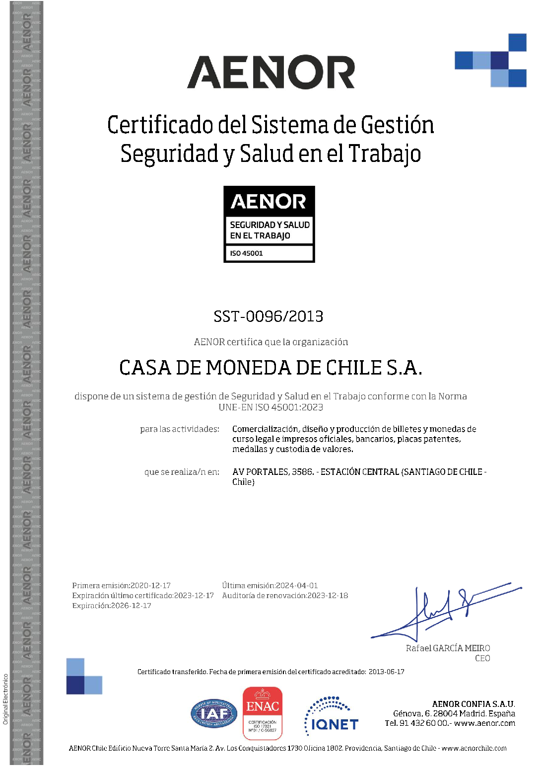 Casa de Moneda de Chile S.A. en su constante compromiso de mejora continua ha desarrollado, implementado y evaluado el desempeño de una serie de Sistemas de Gestión, que avalan el cumplimiento de estándares internacionales en relación a Calidad, Medio Ambiente, Seguridad y salud de las Personas, Seguridad de lo Procesos de Impresión, Seguridad de la Información, Igualdad de Género y Conciliación de la Vida Laboral, Personal y Familiar.