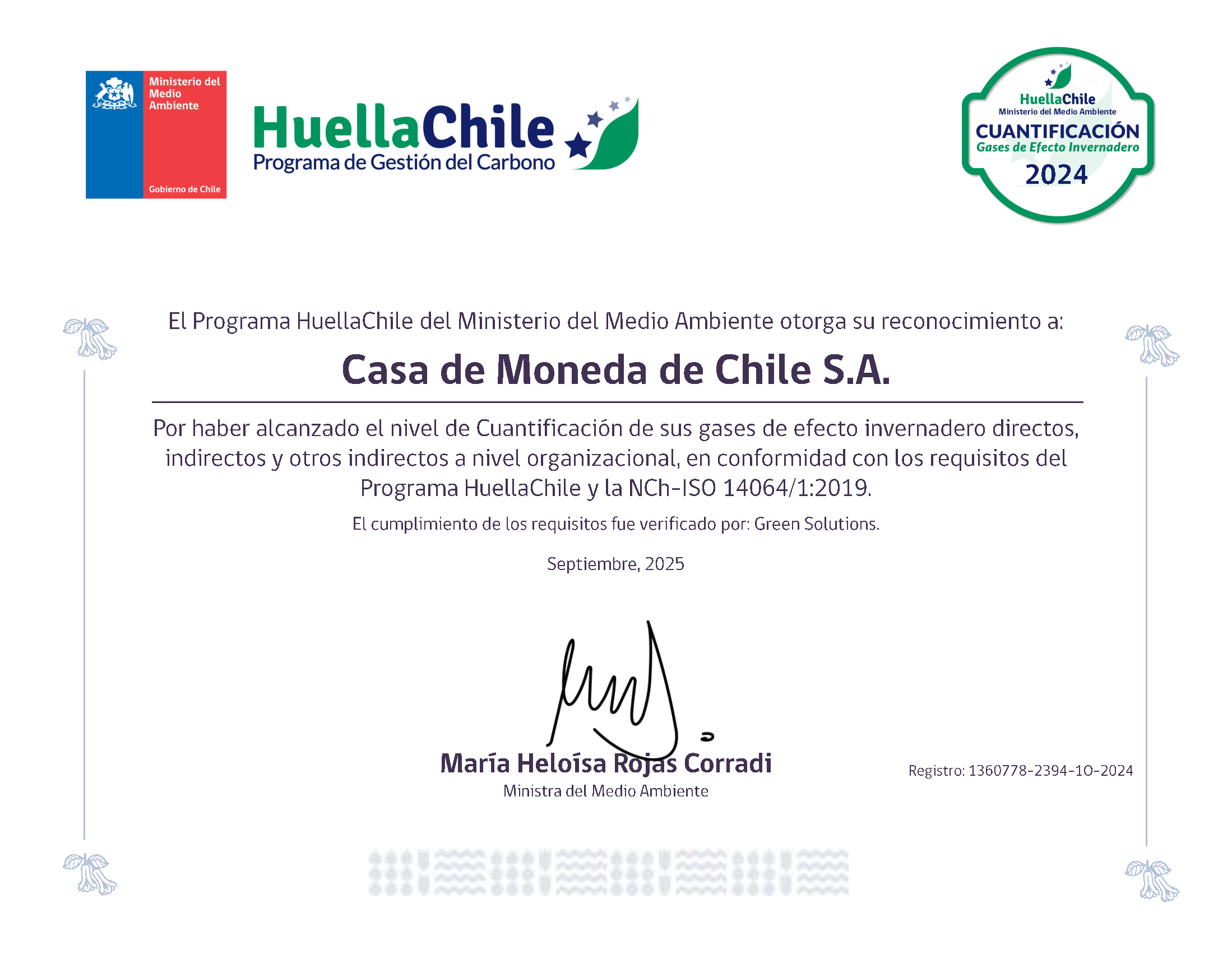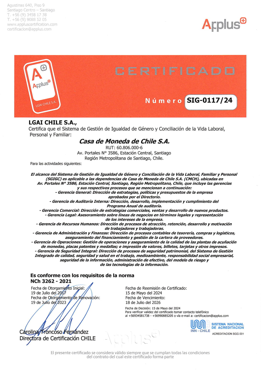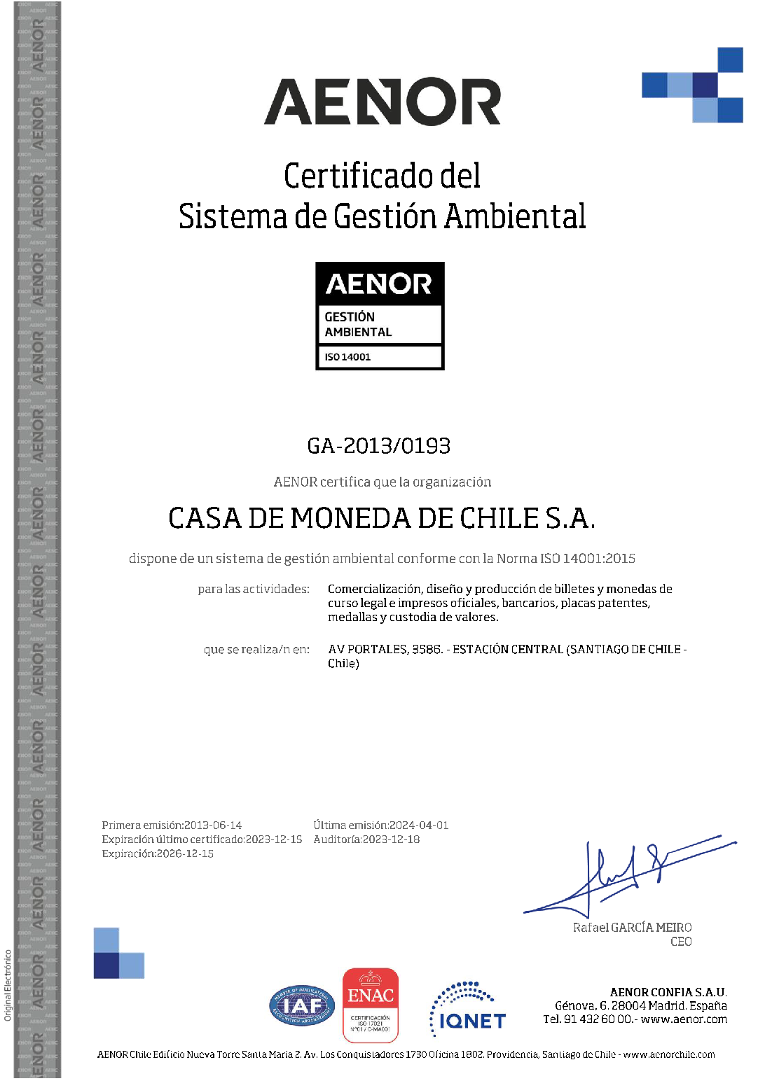 Casa de Moneda de Chile S.A. en su constante compromiso de mejora continua ha desarrollado, implementado y evaluado el desempeño de una serie de Sistemas de Gestión, que avalan el cumplimiento de estándares internacionales en relación a Calidad, Medio Ambiente, Seguridad y salud de las Personas, Seguridad de lo Procesos de Impresión, Seguridad de la Información, Igualdad de Género y Conciliación de la Vida Laboral, Personal y Familiar.