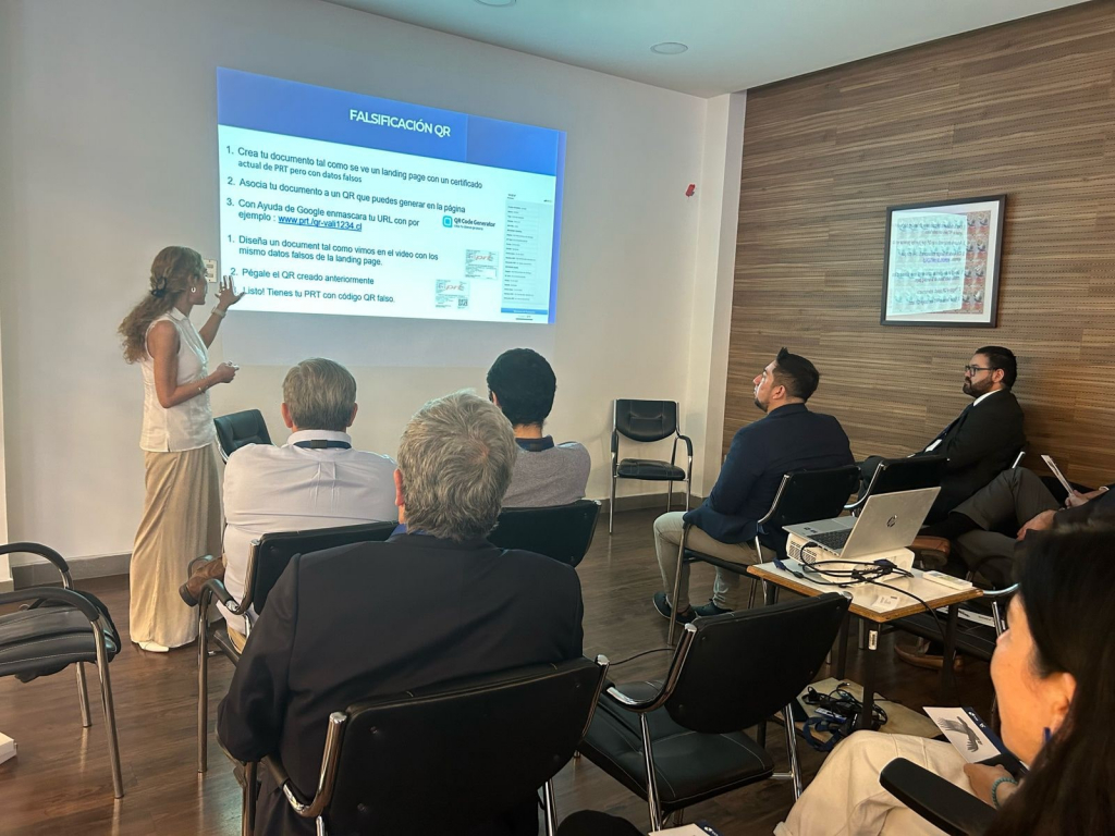 La gerenta comercial, Ángela Movillo Hermosilla, los recibió en una reunión donde expuso los principales productos de la empresa relacionados a seguridad y trazabilidad, que facilitan, por ejemplo, el control y rastreo de productos, y la verificación de instrumentos públicos.