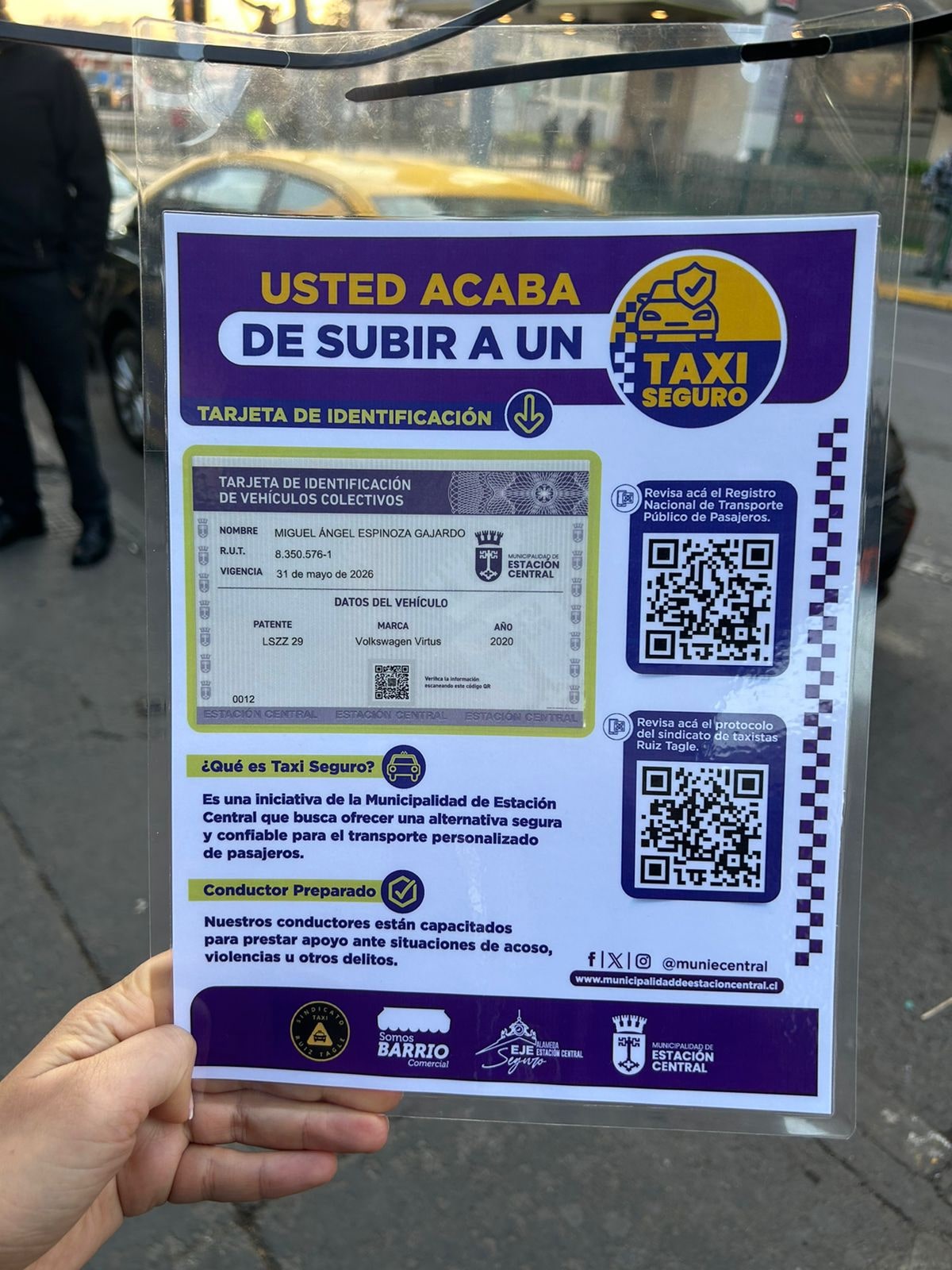 El pasado miércoles 18 de junio, la Municipalidad de Estación Central presentó oficialmente la iniciativa Taxi Seguro, un programa pionero, que busca enfrentar la inseguridad en el sector de los terminales de buses y combatir la proliferación de taxis piratas que operan de manera irregular, poniendo en riesgo a miles de pasajeros y otros muchos cobrando tarifas abusivas. La actividad se realizó en conjunto con el Sindicato de Taxis Ruiz Tagle, la Casa de Moneda de Chile, el Secretario Regional Ministerial de Transportes y la División de Fiscalización del Ministerio de Transportes y Telecomunicaciones. Contó con una alta participación de autoridades, dirigentes gremiales, vecinos y vecinas del sector. En la ocasión, se hizo entrega del sello Taxi Seguro a los conductores capacitados, quienes ahora cuentan con un cartel visible al interior del vehículo, que incluye información del chofer, patente del vehículo, número de emergencia y una huella digital para verificación ciudadana, sumado a un sticker en el parabrisas.