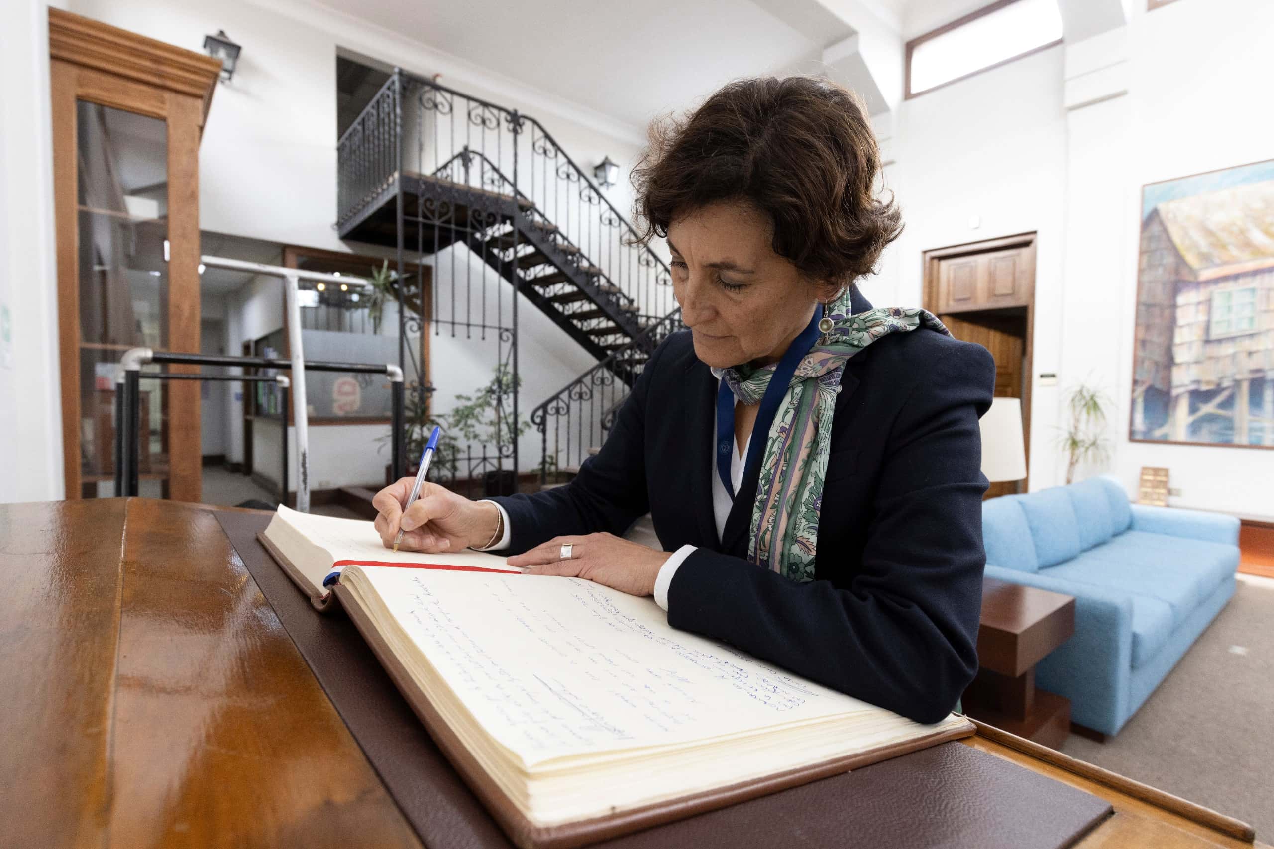 En la ocasión, la ministra fue recibida por la presidenta del Directorio, Verónica Montellano, el gerente General, Carlos Tolosa y la gerenta Comercial, Ángela Movillo. En la reunión, se le presentó las distintas líneas de negocio de la empresa y el desarrollo de soluciones tecnológicas orientadas a proteger documentos, como certificados, credenciales, entre otros.