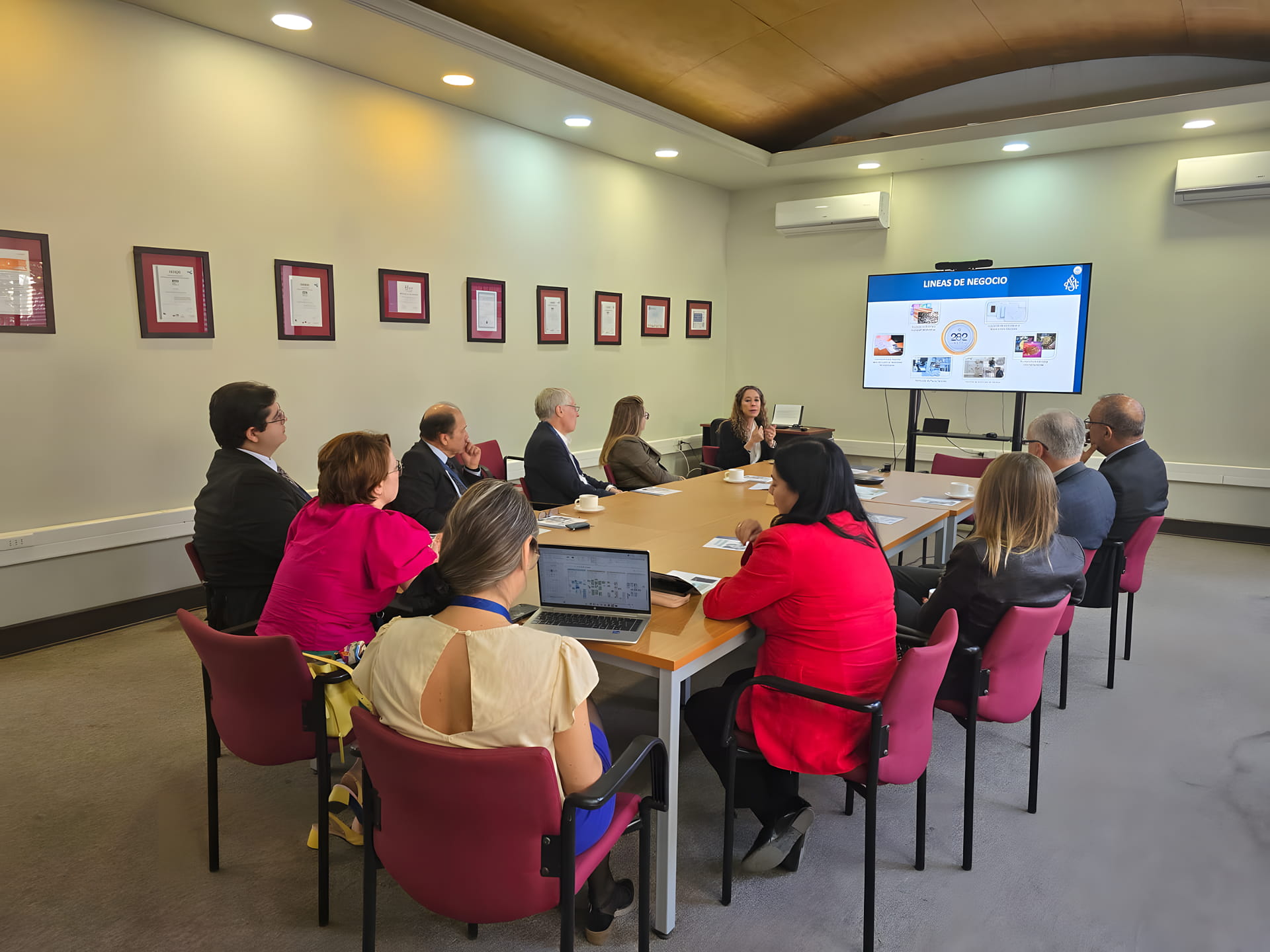 El Rector fue recibido por la gerenta comercial, Ángela Movillo H., junto con la jefa de cuentas clave KAM, Gennevive Pozo B. En la reunión, se presentaron las principales líneas de negocio de la empresa, enfocadas en soluciones de seguridad y trazabilidad, que permiten la verificación de instrumentos públicos.